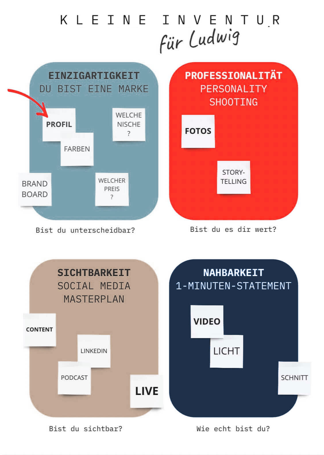 Alle drei Varianten von besteht aus fünf Modulen – von der Inventur über das Erscheinungsbild deiner Inhalte bis zum Flow der Kundengewinnung, sodass du am Ende über das komplette Werkzeug einer starken Personenmarke verfügst.