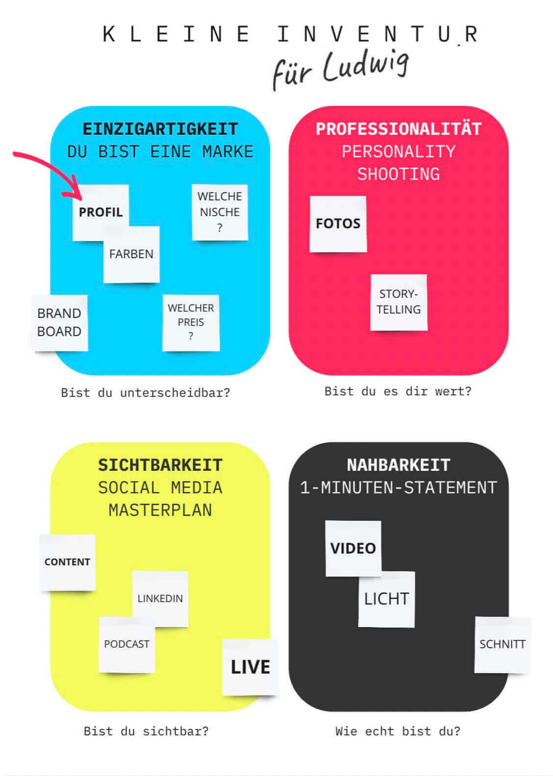 Alle drei Varianten von besteht aus fünf Modulen – von der Inventur über das Erscheinungsbild deiner Inhalte bis zum Flow der Kundengewinnung, sodass du am Ende über das komplette Werkzeug einer starken Personenmarke verfügst.